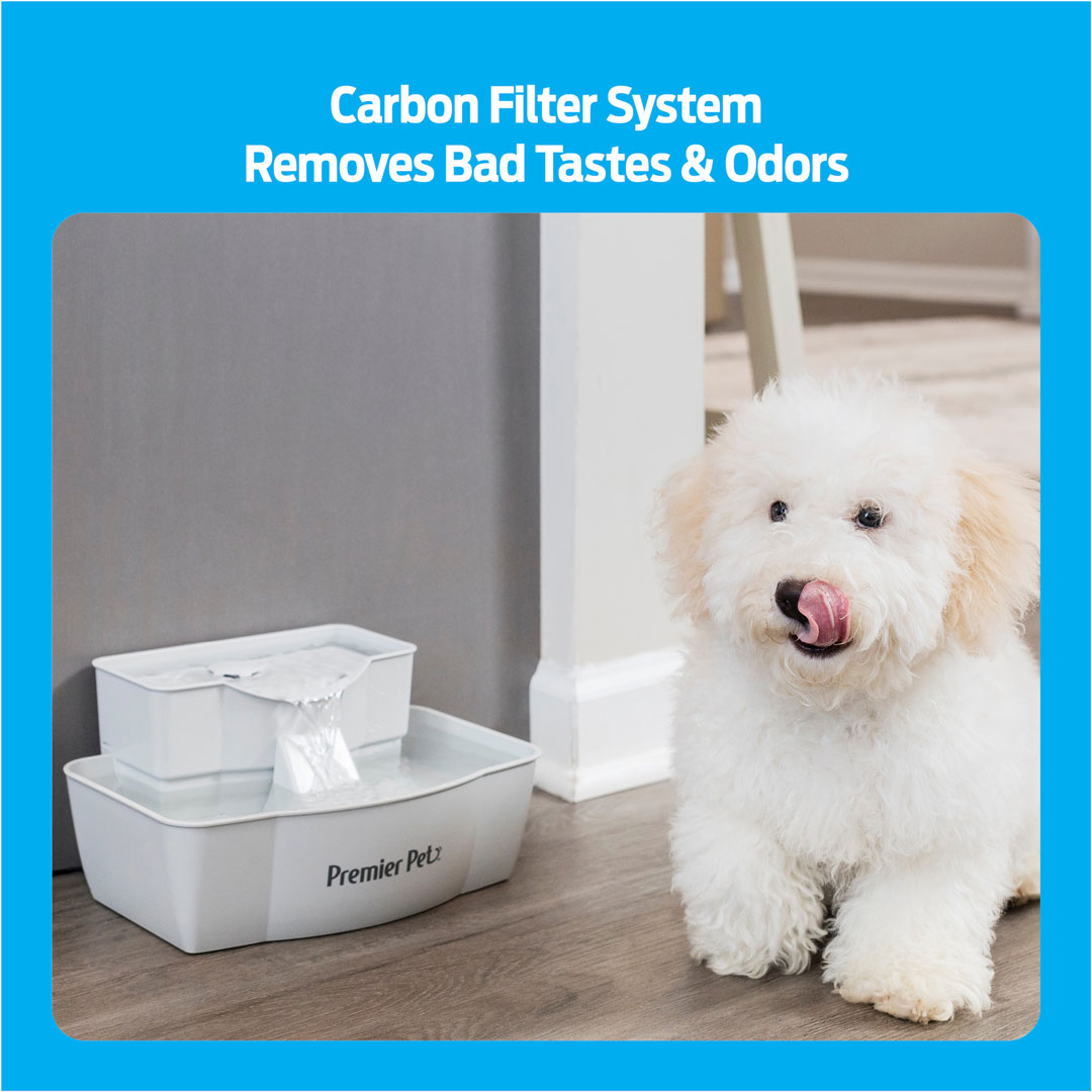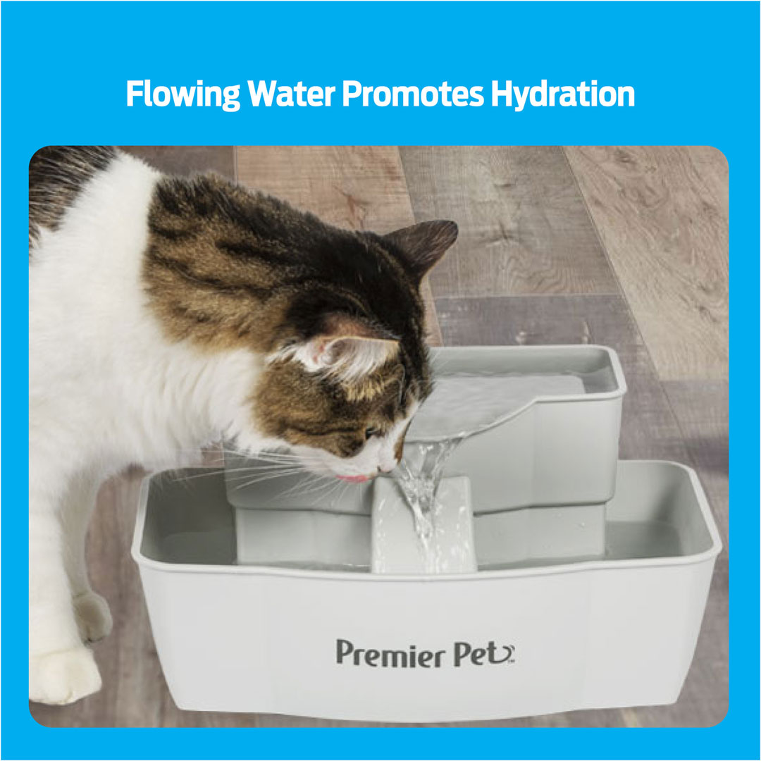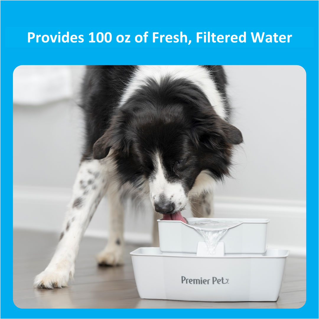 The Premier Pet® 100 oz. Pet Fountain provides your pet with 100 ounces of fresh, filtered water. Featuring a free-falling stream that encourages pets to drink more, therefore supporting urinary and kidney health through proper hydration, and a built-in filter system that includes an activated carbon filter to remove bad tastes and odors. Constant flowing water helps to prevent bacteria growth, keeping the fountain cleaner than a standing water bowl. The large water-holding capacity of up to 100 oz. makes this fountain ideal for cats, dogs of all sizes and multiple pet homes. With multiple drinking options, your pet can choose to drink from the free-falling stream, lower bowl with still water or the elevated bowl, which is great for senior or arthritic pets. The BPA-Free plastic design comes apart to make cleaning easy and is top-shelf dishwasher safe (excluding pump). Give yourself the happier, healthier pet you deserve by giving them the Premier Pet 100 oz. Pet Fountain!