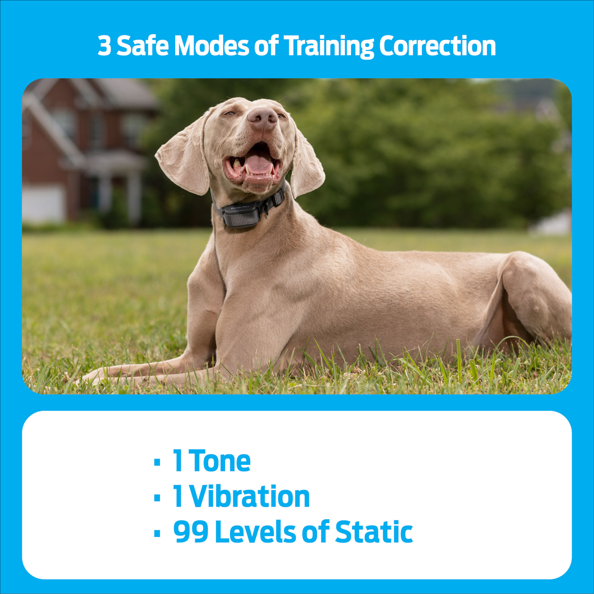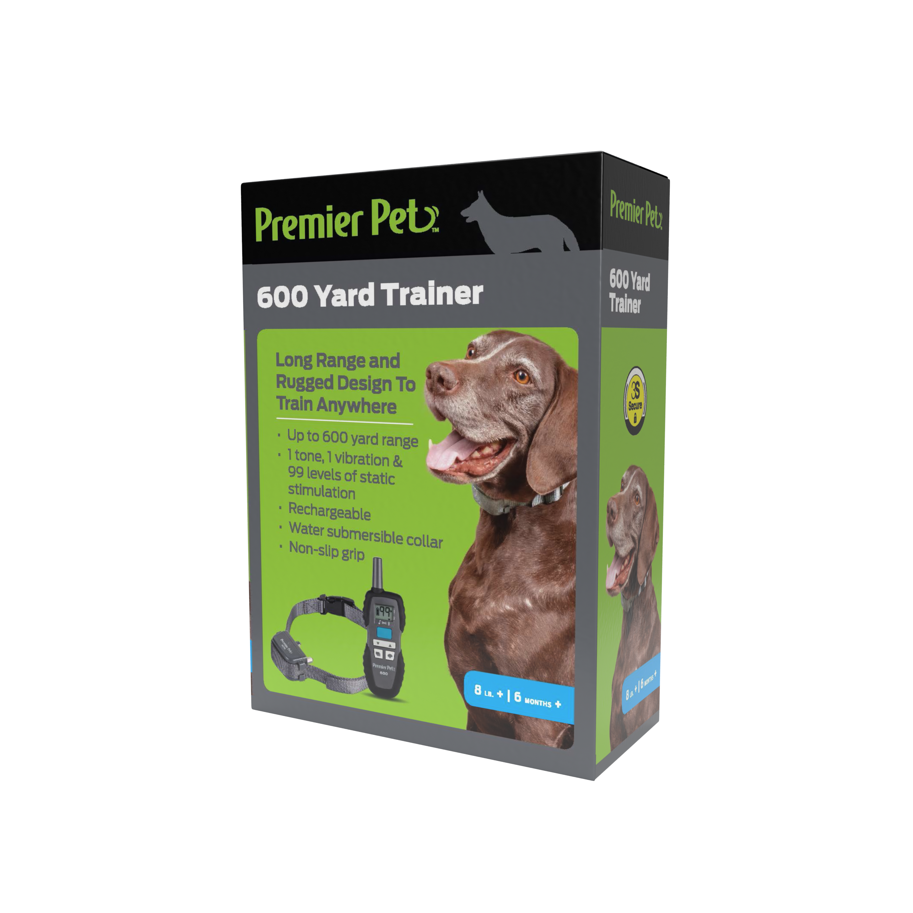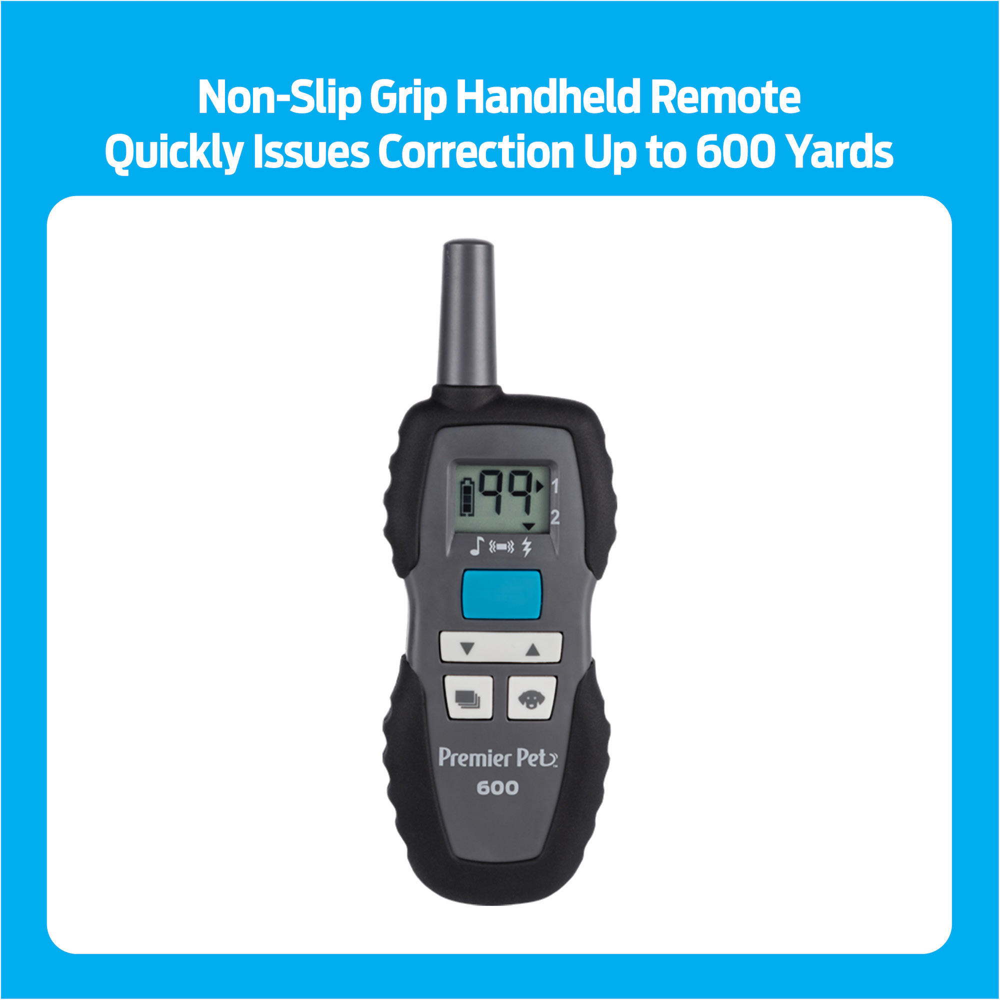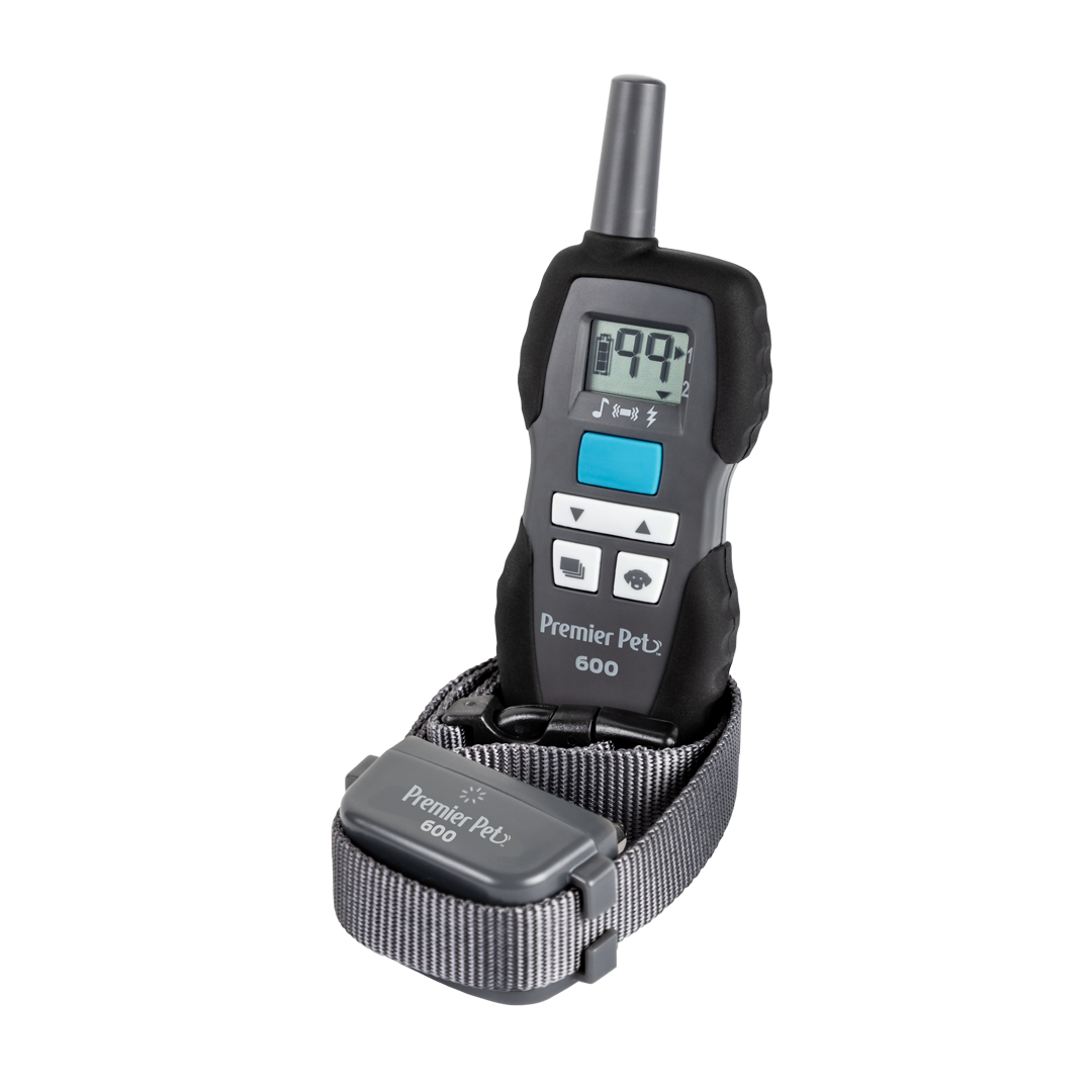 The Premier Pet® 600 Yard Trainer helps you correct unwanted behaviors in your dog, small or large, by allowing you to communicate and effectively enforce the rules in a way that is easy for your dog to understand. By pressing the clearly labeled buttons on the non-slip grip handheld remote, you can customize to your dog’s needs with 3 safe modes of training corrections: 1 tone, 1 vibration, 99 levels of static stimulation. The included rechargeable, water submersible training collar has a nylon strap that is adjustable up to 26”, making it a great fit for both smaller and larger dogs. A low battery indicator on the collar will alert you when the collar battery should be replaced. This system can be expanded, providing an effective training tool for up to two dogs using the same remote (extra collar available through Customer Care). Whether you’re hunting, camping, hiking, or just want to do a leash-free walk with your dog, the rugged, weather-proof design of the Premier Pet® 600 Yard Trainer gives those who love the great outdoors the ideal option for long-range dog training!