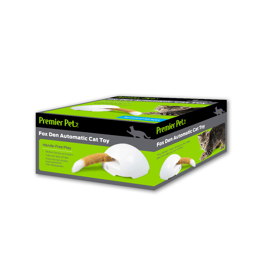The Premier Pet® Fox Den Automatic Cat Toy keeps your cat active and entertained with a motion activated fox tail that shakes back and forth then disappears. After installing the batteries (not included), turn the toy on with the press of a button, and it will begin flipping the fuzzy fox tail around, encouraging your cat to stalk and pounce on it. After 10 minutes of playtime, the toy will automatically shut off to let your cat rest, and it can be turned back on at any time. Hold down the power button to turn on “Play While You Are Away” mode. This mode turns the toy on for 10 minutes every two hours. After three 10-minute playtimes, the toy will shut off until you turn it back on. While in this mode, the motion sensor is activated, automatically turning the toy on when nearby movement is detected. By encouraging your cat to exercise and providing mental stimulation, this toy helps keep your cat happy and healthy.